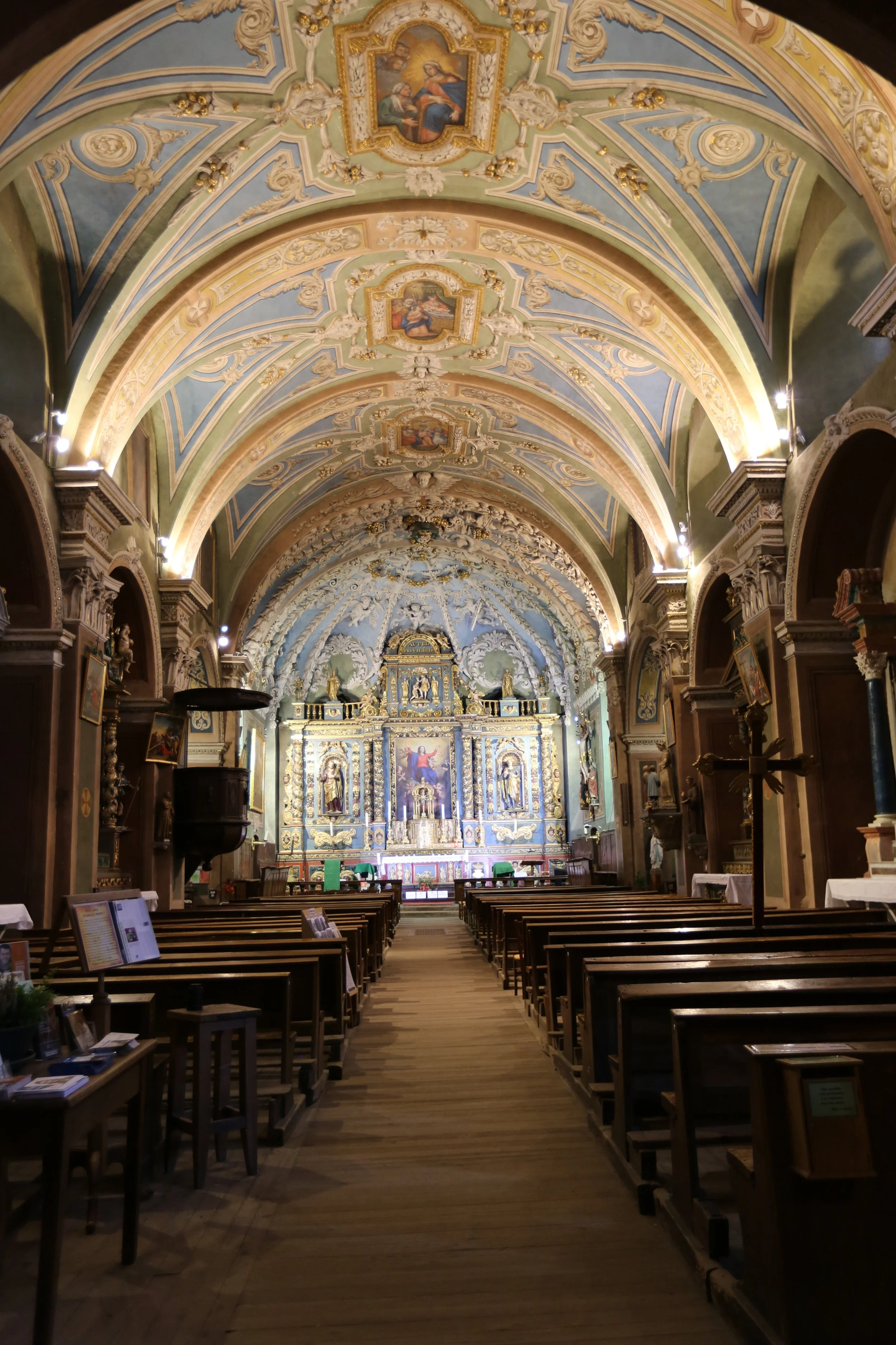 D’où l’exaltation des couleurs des peintures et le décor grandiose d’anges et de guirlandes de la gypserie du chœur au-dessus du grand retable sculpté par le chambérien François Rimelin avec, au-dessus de l’autel, un tabernacle doré rappelant l’importance de l’Eucharistie. L’église compte également huit autels latéraux dont les peintures rappellent tantôt les dévotions chères à l’époque, tantôt la fréquentation de pèlerinages situés en Piémont (Oropa) ou près de l’Adriatique (Loreto). La voûte de la nef peinte en trompe-l’œil met en scène, dans des médaillons, des scènes de la vie de la Vierge et du Christ. Ce monument prestigieux par la richesse de son mobilier et de son décor a été classé par les Monuments Historiques dès 1945.